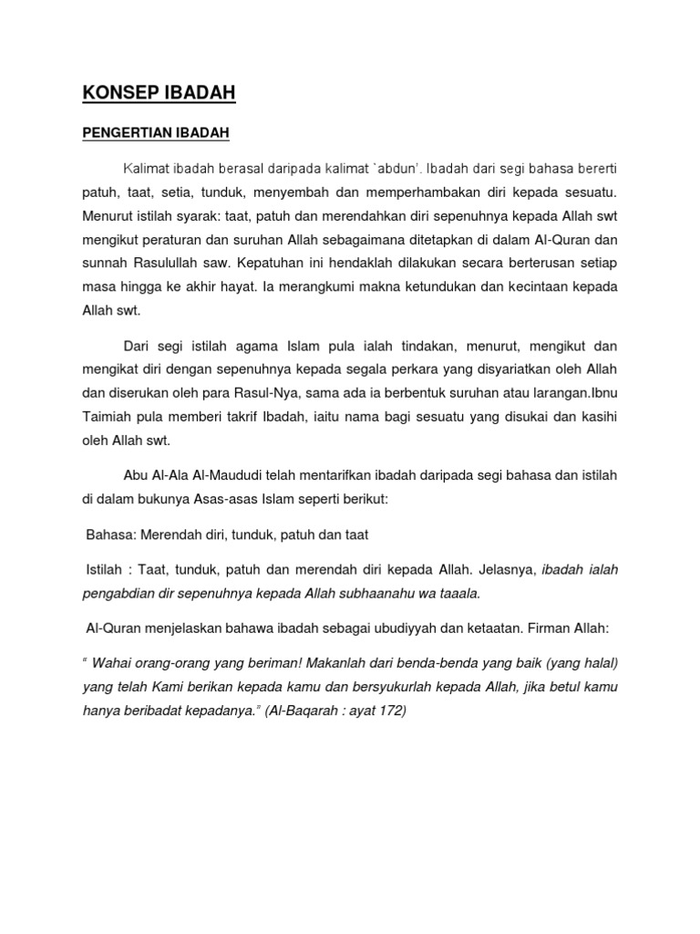 Web KONSEP IBADAH DALAM ISLAM IBADAH Bahasa - merendah diri patuh dan taat Ibadah Istilah - khusyuk kepada Allah SAW merendah diri dan tetap hati kepada-Nya. Menjelaskan konsep ibadah dari aspek maksud ibadah ibadah khusus dan ibadah umum.